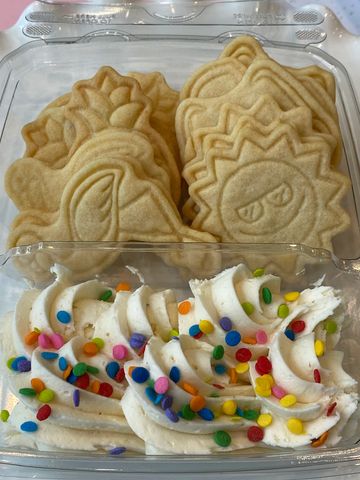 Our rolled sugar cookies with a frosting dip in tamper-safe individual packages. Includes suns, sunglasses, flamingos and pineapples. 12 cookies per kit, 6 kit minimum order.