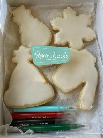 Our rolled sugar cookies with white royal icing and edible markers. Minimum 5 kits per custom order. Each kit comes in its own gift box with its own set of markers. Mix of shapes, email for options.